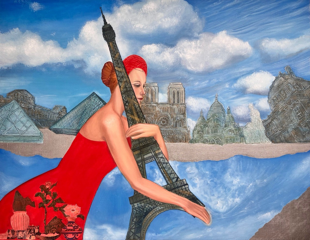 Женская фигура удерживает Эйфелеву башню как материализованную память, носитель времени. Предметы на юбке — фрагменты повседневности, которые художник заснял в съемной парижской квартире — показывают, как личная привязанность к прошлому структурирует реальность и превращает город в удерживаемый внутренний ландшафт.