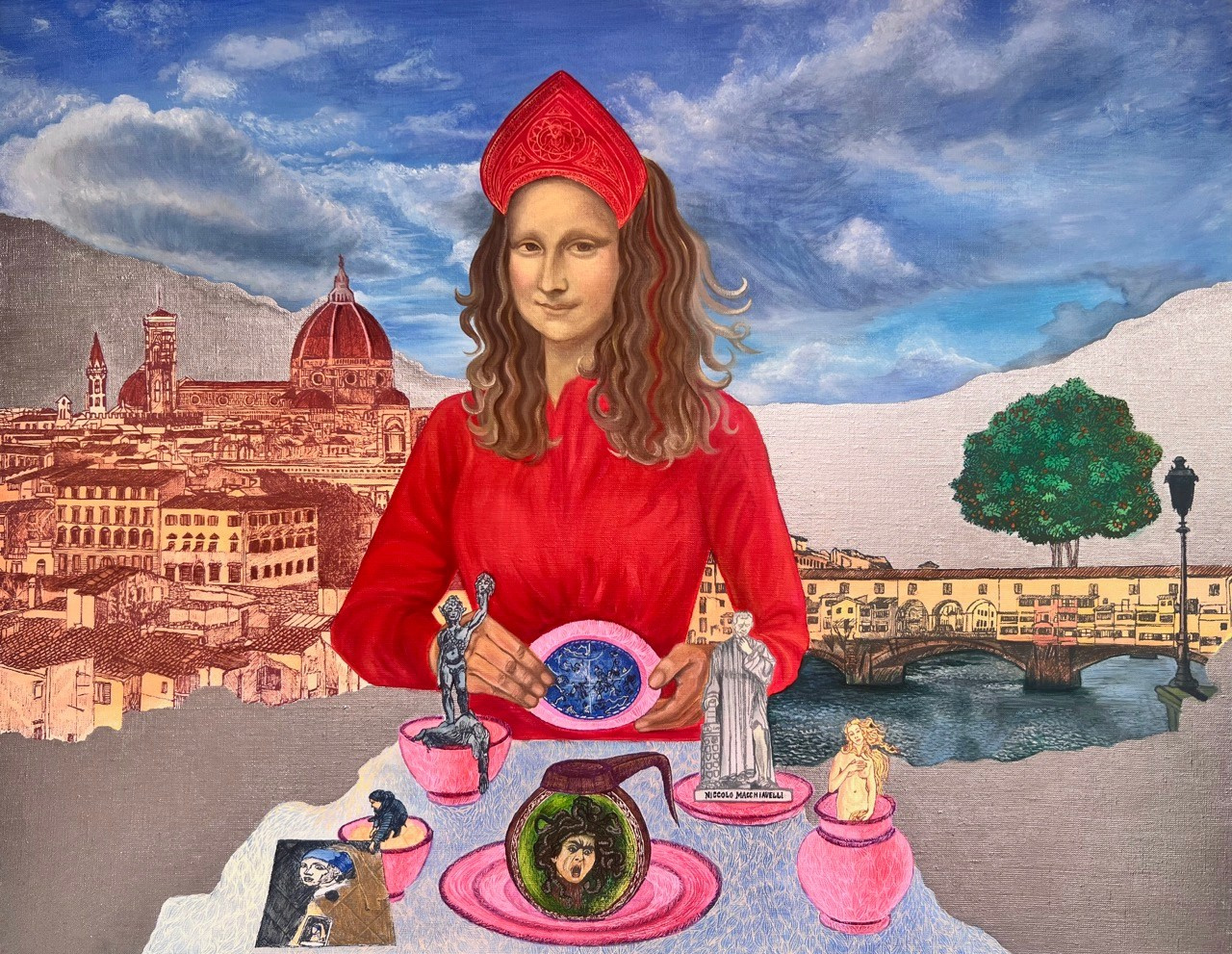 В центре композиции — узнаваемый ренессансный портрет. Выбор героини не случаен — Мона Лиза рождалась во Флоренции. Размеренно-ироничная, она будто пропустила через себя город и теперь удерживает его в ладонях в образе звездного неба из базилики Сан-Лоренцо. Перед ней кофейный сервиз. Кофе отсылает к итальянской повседневности, к ритуалу паузы, в которой рождается мысль. Флоренция — известный центр кофе, но напиток здесь — не столько бытовая деталь, сколько символ созерцательного времени, момента «между», когда впечатления оседают и становятся опытом. На столе культурные образы Флоренции: Персей Челлини, Никколо Макиавелли, рожденная Венера и Медуза из галереи Уффици, все они — ингредиенты, из которых варится личное восприятие города. И наравне с ними уличный художник, рисующий мелками «Девушку…» Яна Вермеера, талантливый современник, который вызвал эмоции и его захотелось поместить в одну линию с великим наследием.